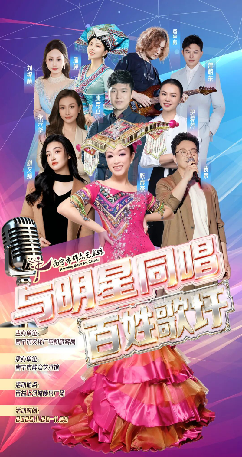 南宁市群众艺术馆「与明星同唱·百姓歌圩」直接把“舞台自由”给咱安排上——11月28日-29日晚19:30,百益上河城喷泉广场,你不仅能听明星唱,还能看20位网络选出的市民实力唱将和他们同台飙歌!