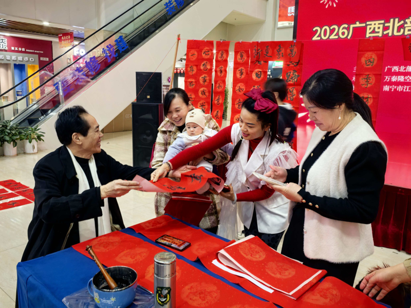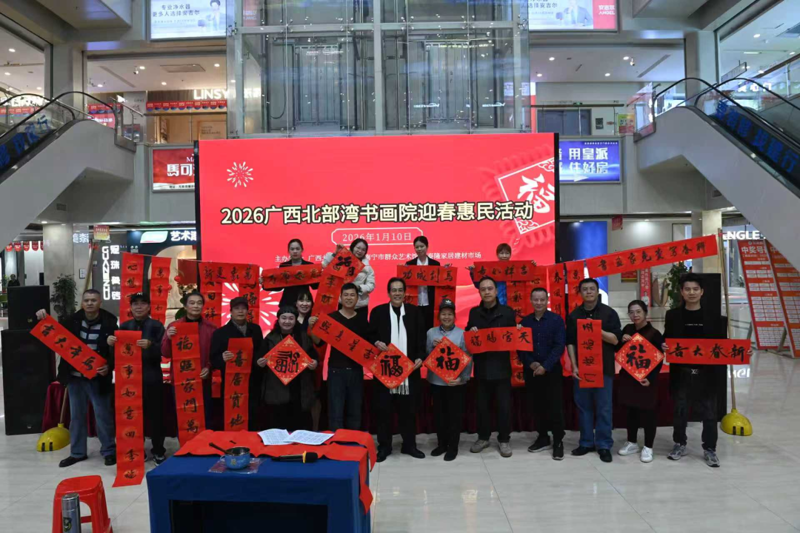 2026年1月10日,由南宁市群众艺术馆联合广西北部湾书画院主办、万泰隆空中花园承办的“迎春送福”文化惠民志愿服务活动,在南宁万泰隆家具城广场温情举行。活动依托文化志愿服务体系,组织文化志愿者深入市场一线,以传统书法艺术为载体,为广大商户、企业员工及市民送上新春祝福,让中华优秀传统文化在基层落地生根、温润人心。