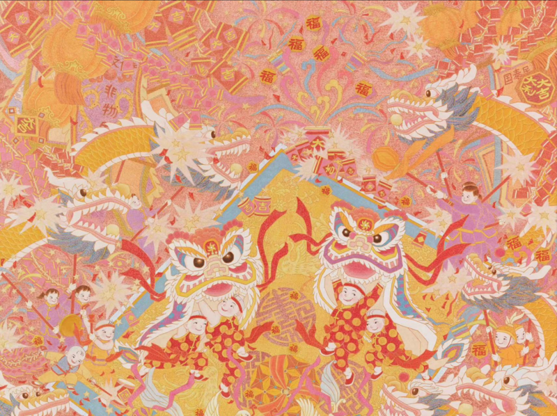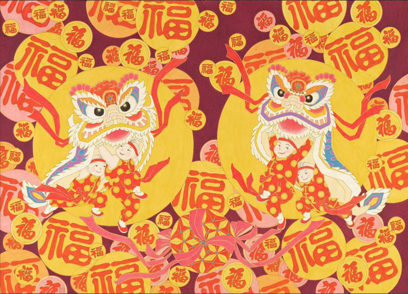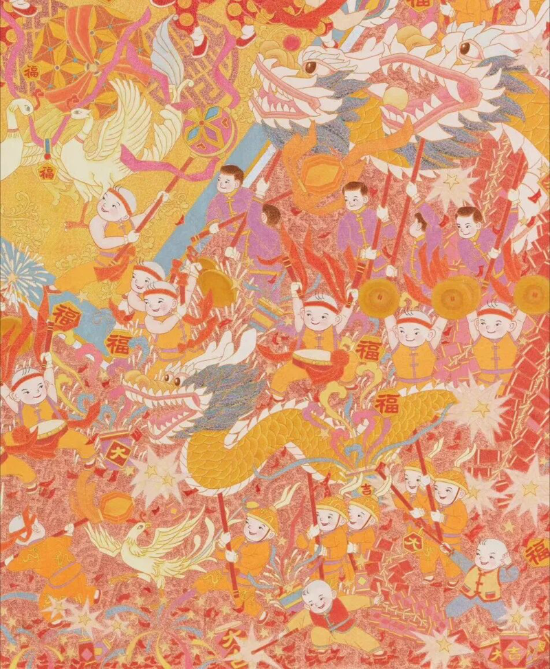 在她的画作里,新年的福气变得可见可感。《狮跃迎福》以奔放的线条与对比强烈的色块,捕捉醒狮腾跃的动感瞬间,传递出辟邪纳吉、生机勃发的力量;《欢乐炮龙节》则再现了传统民俗活动的热烈场面,将舞龙欢庆、烟火绽放的集体喜悦凝固于画布之上,洋溢着辞旧迎新、共享盛世的欢腾气象。这些作品既继承了传统农民画中强烈的装饰意味、乐观的精神内核与地域特色,又融入了艺术家个人的现代审美思考与形式探索,形成了独具一格的新乡土风格。展览呈现精彩,欢迎大家欣赏!