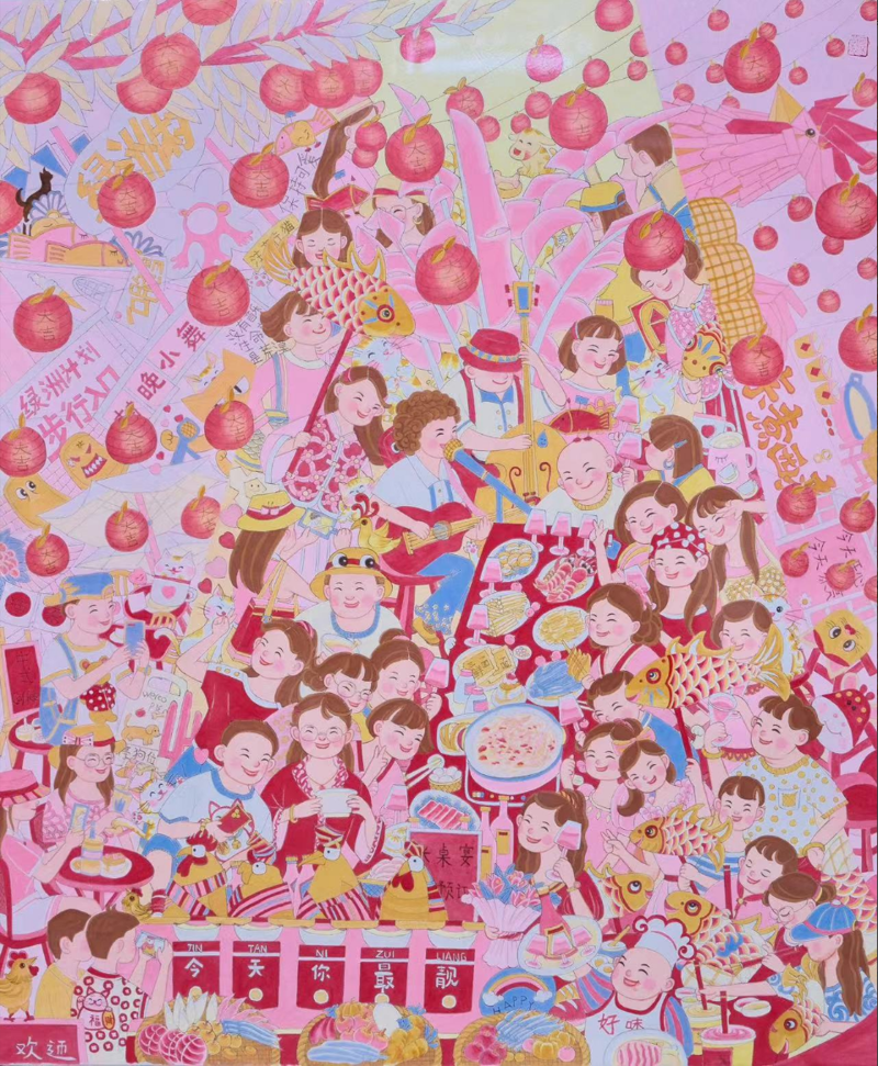 福赠丹青祈丰年,云端展卷迎新春。为传承中华优秀传统文化,丰富群众的精神文化生活,我们于丙午新春之际,特别推出本期线上展览,聚焦艺术家雷音音根植于农民画传统的新乡土绘画作品。她的创作以炽热的情感、饱满的色彩和质朴的叙事,将八桂大地的风土人情、节庆民俗转化为一幅幅生机盎然的视觉诗篇,在浓浓年味中传递着最真挚的吉祥祝愿。