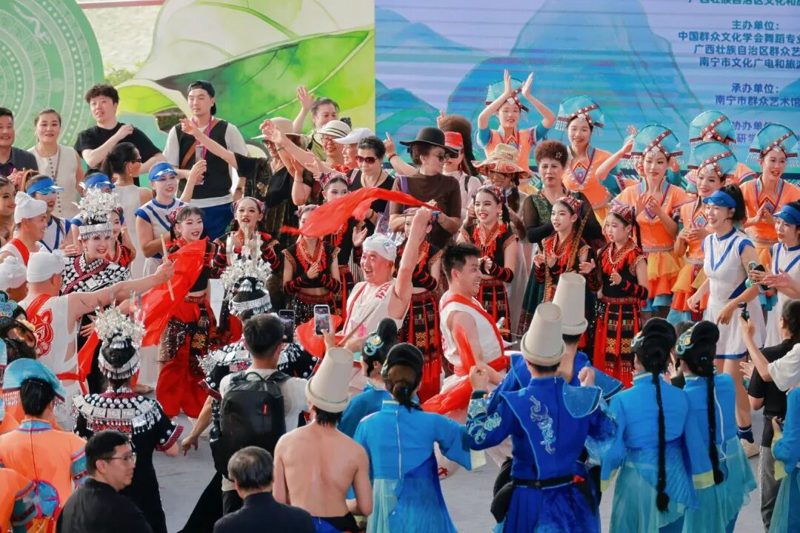 这是“舞动+”全国品牌活动首次走进广西、相约南宁,为即将到来的广西三月三文化盛会再添浓墨重彩的一笔。来自北京、上海、贵州、山东等全国11个省市的近400名舞蹈专家、群文骨干、舞蹈爱好者齐聚绿城,以舞为媒、在青山绿水间,共赴一场融汇地域风情、非遗文脉、时代活力的舞蹈之约。