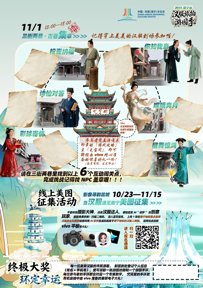 当千年汉服邂逅绿城古巷,一场跨越时空的国风盛宴即将开启。11月1日,2025南宁市汉服旅拍游园季首站——三街两巷·古巷集章精彩来袭!