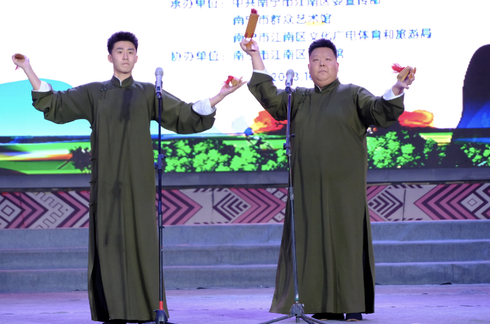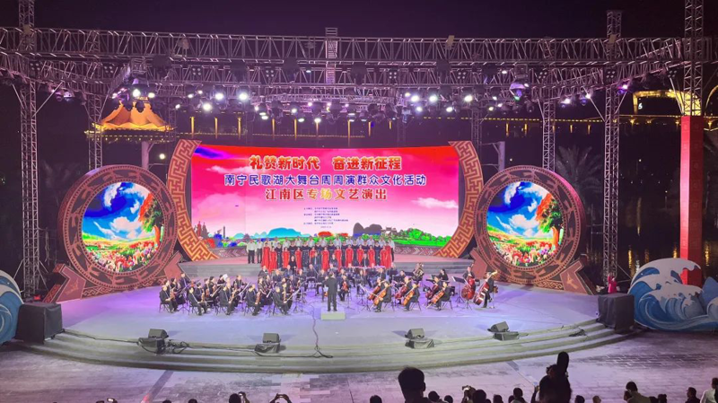 10月14日晚,“礼赞新时代·奋进新征程”南宁民歌湖大舞台周周演群众文化活动江南区专场文艺演出在民歌湖大舞台举行。晚会通过歌舞、相声、杂技、器乐等不同类型的节目充分展现江南区底蕴深厚的平话文化和风土人情。