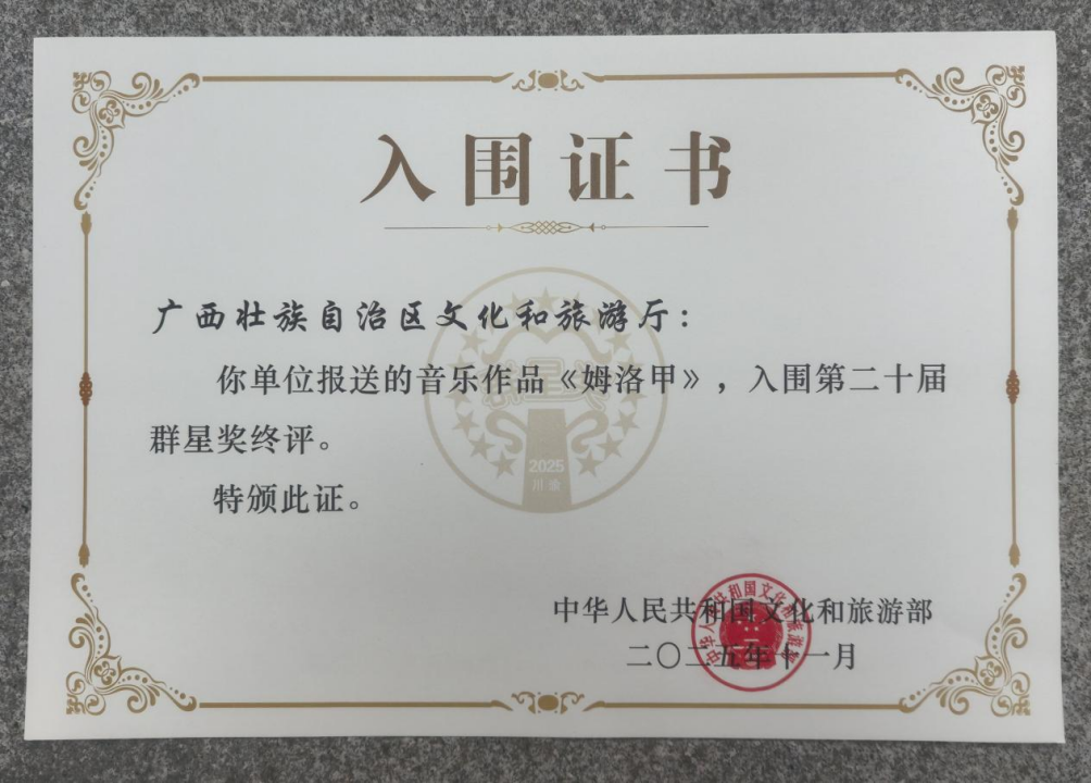 此外,由南宁市文化广电和旅游局、南宁市群众艺术馆精心打造,谭斯译作曲、区晓菲作词,由袁泉、唐淑琳、滕符巾、唐丽沙演唱的音乐作品《姆洛甲》,获得第二十届群星奖入围奖,实现了该类型作品的突破,为南宁市赢得殊荣。