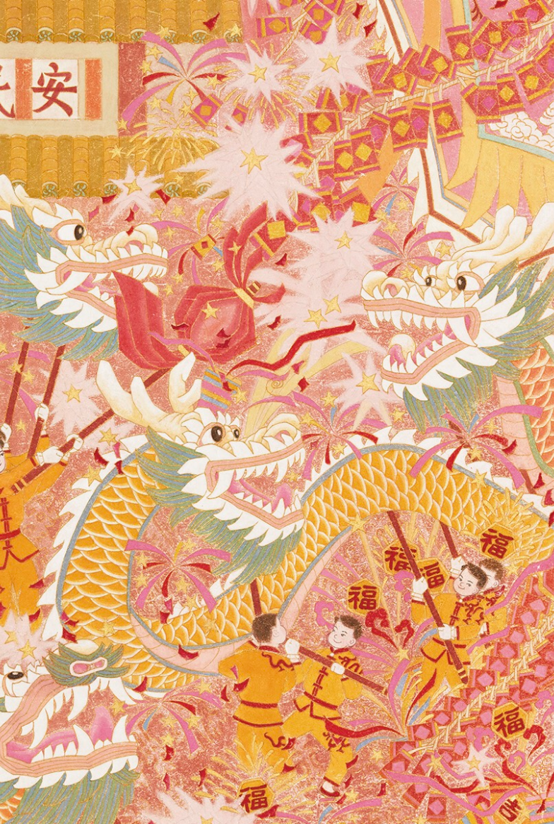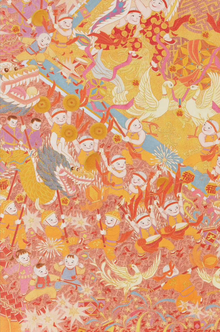 在她的画作里,新年的福气变得可见可感。《狮跃迎福》以奔放的线条与对比强烈的色块,捕捉醒狮腾跃的动感瞬间,传递出辟邪纳吉、生机勃发的力量;《欢乐炮龙节》则再现了传统民俗活动的热烈场面,将舞龙欢庆、烟火绽放的集体喜悦凝固于画布之上,洋溢着辞旧迎新、共享盛世的欢腾气象。这些作品既继承了传统农民画中强烈的装饰意味、乐观的精神内核与地域特色,又融入了艺术家个人的现代审美思考与形式探索,形成了独具一格的新乡土风格。展览呈现精彩,欢迎大家欣赏!